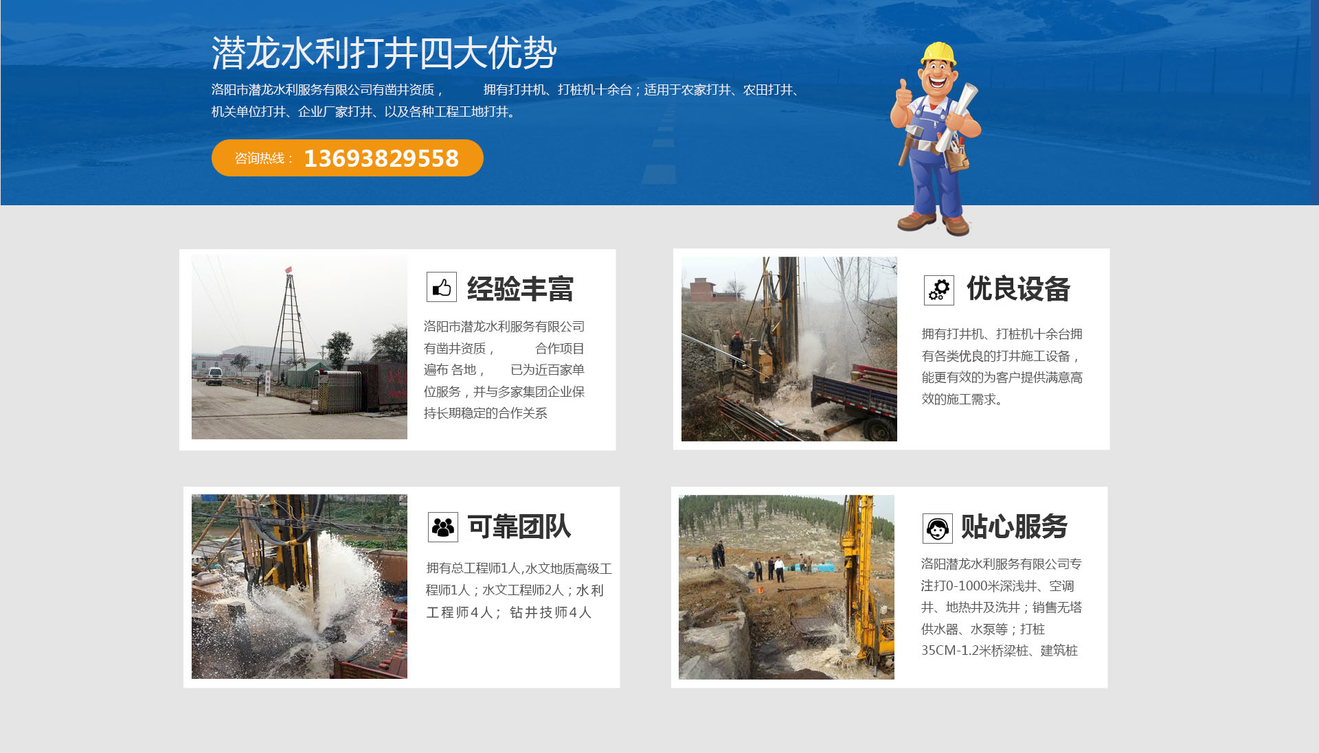 洛陽市潛龍水利服務(wù)有限公司成立于2009年,注冊資金200萬元,擁有河南省水井供水技術(shù)協(xié)會頒發(fā)的河南省水井施工單位壹級資質(zhì)證書,公司擁有打井機(jī)、打樁機(jī)十余臺;適用于農(nóng)家打井、農(nóng)田打井、機(jī)關(guān)單位打井、企業(yè)廠家打井、以及各種工程工地打井。洛陽潛龍水利服務(wù)有限公司打0-1000米深淺井、空調(diào)井、地?zé)峋跋淳讳N售無塔供水器、水泵等;打樁35CM-1.2米橋梁樁、建筑樁等;代辦洗井業(yè)務(wù);農(nóng)業(yè)水利灌溉,土地開發(fā)整理項(xiàng)目可行性研究、編制、規(guī)劃、設(shè)計、預(yù)算編制、標(biāo)書編制、水利技術(shù)咨詢服務(wù)。
